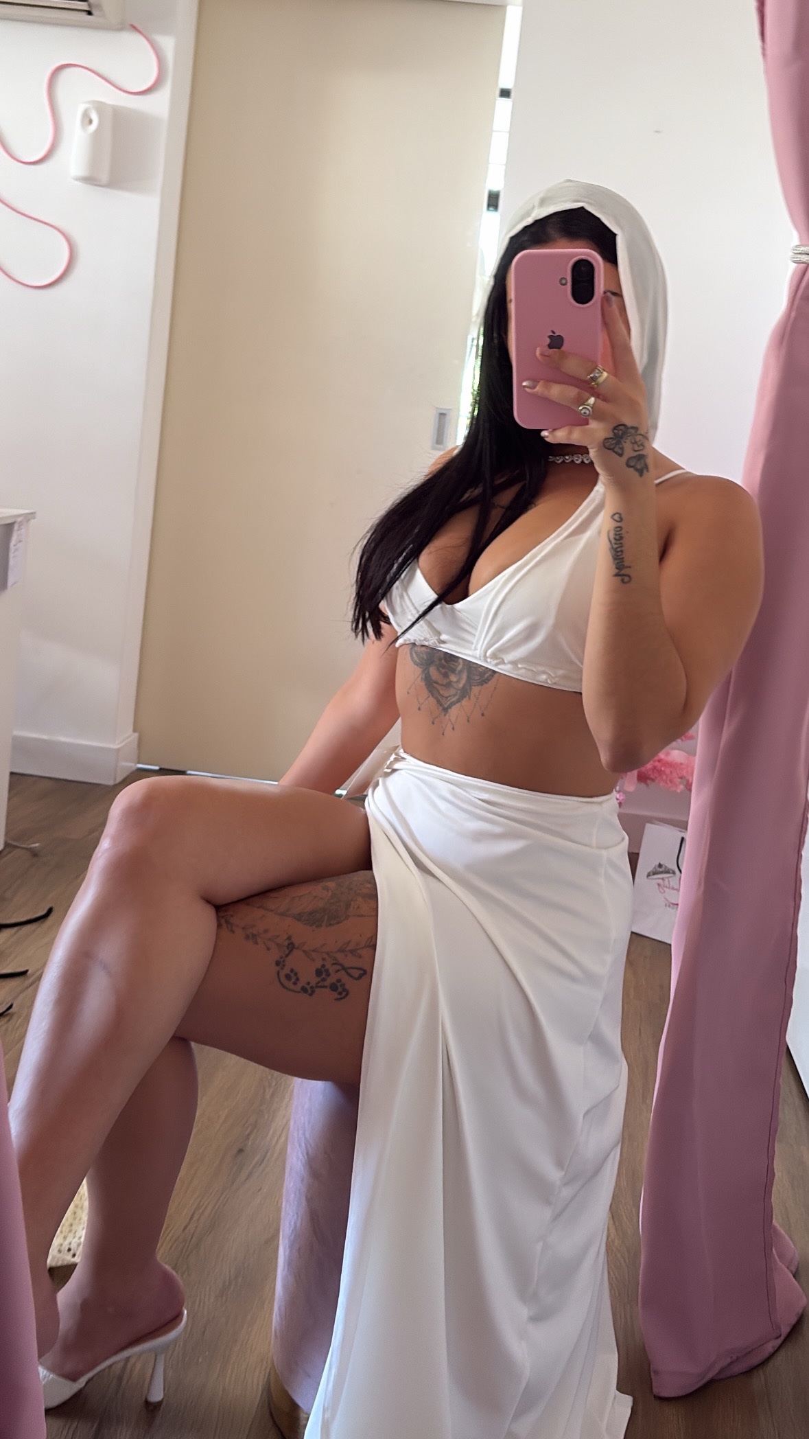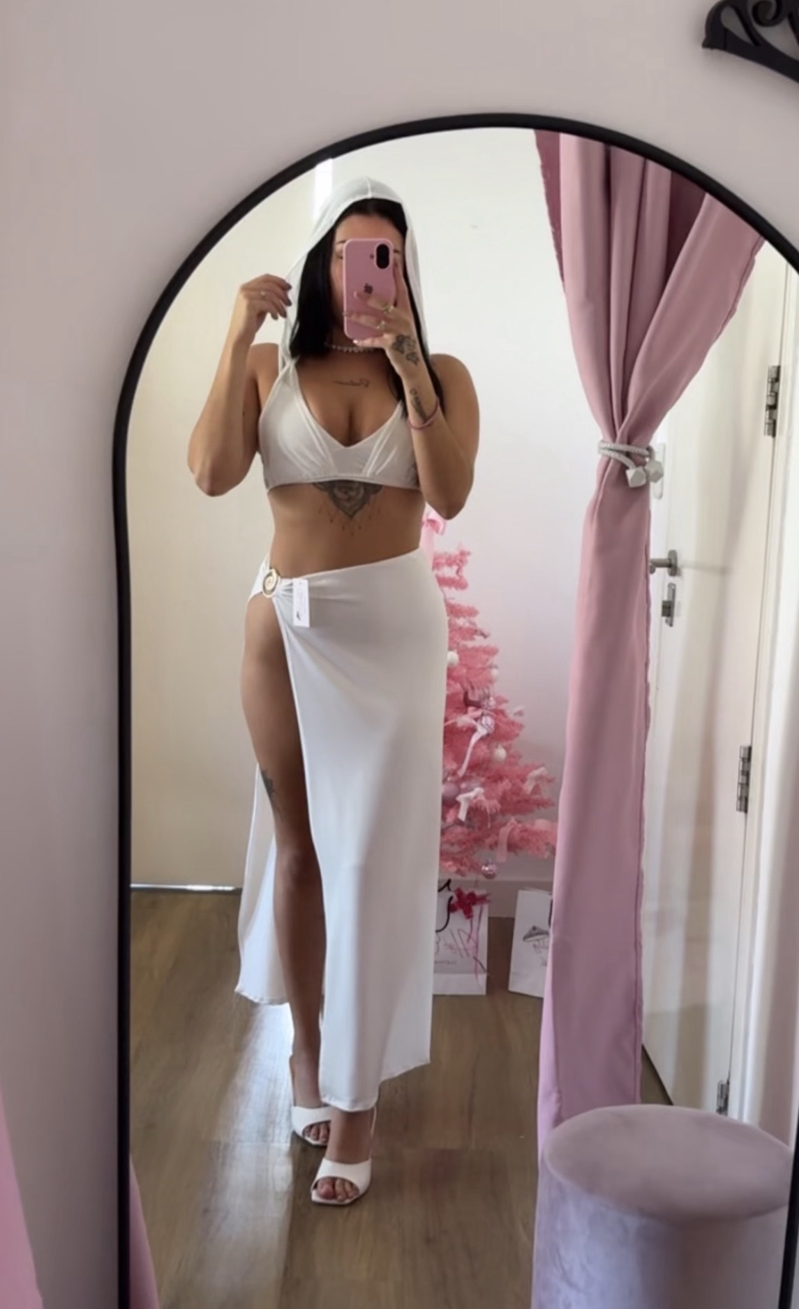 Hermoso conjunto de tres piezas, lleva pollera larga con tajo, top de tul con capucha y top armado taza