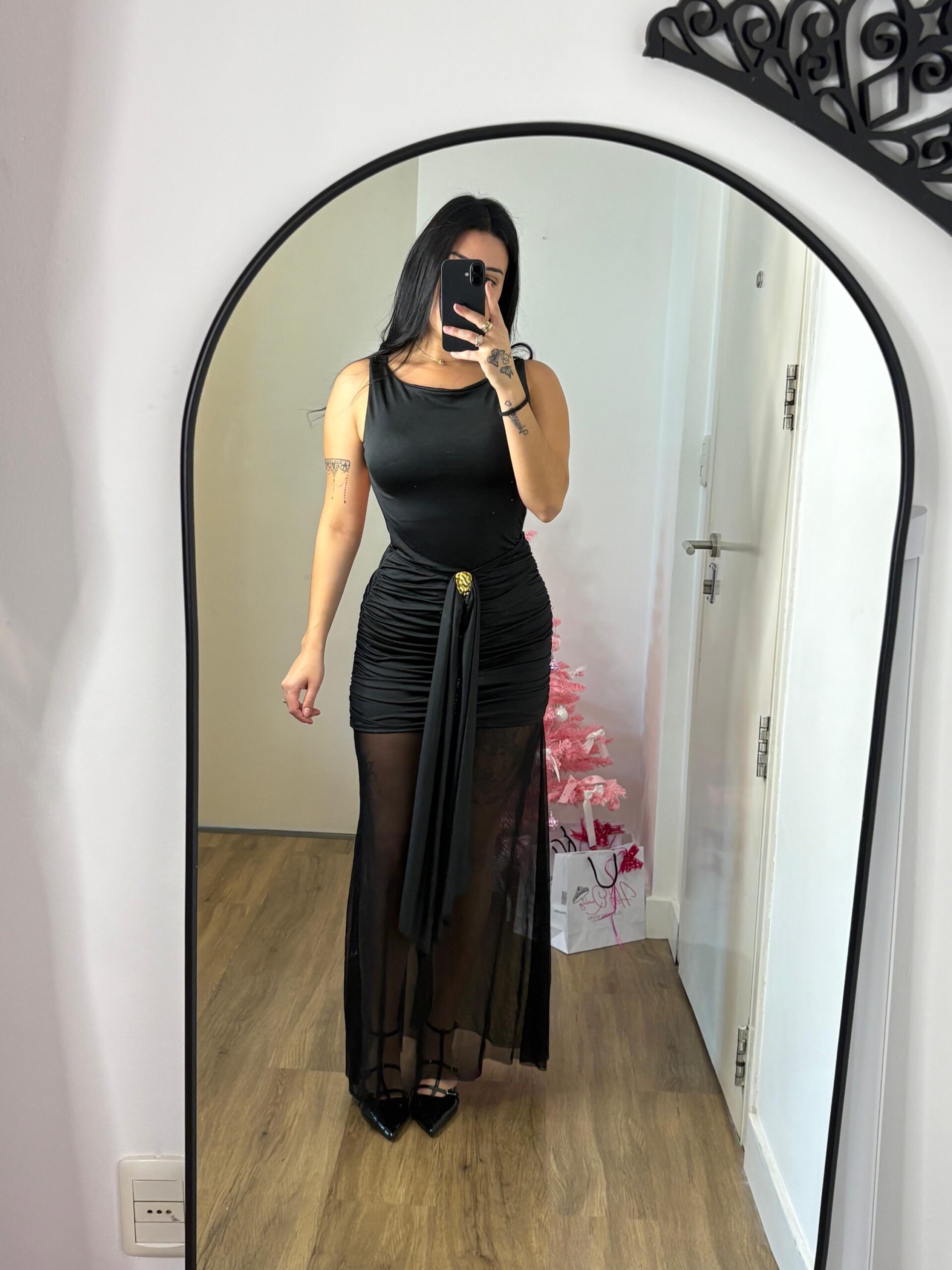 Vestido largo con aplique dorado y transparencia en tul