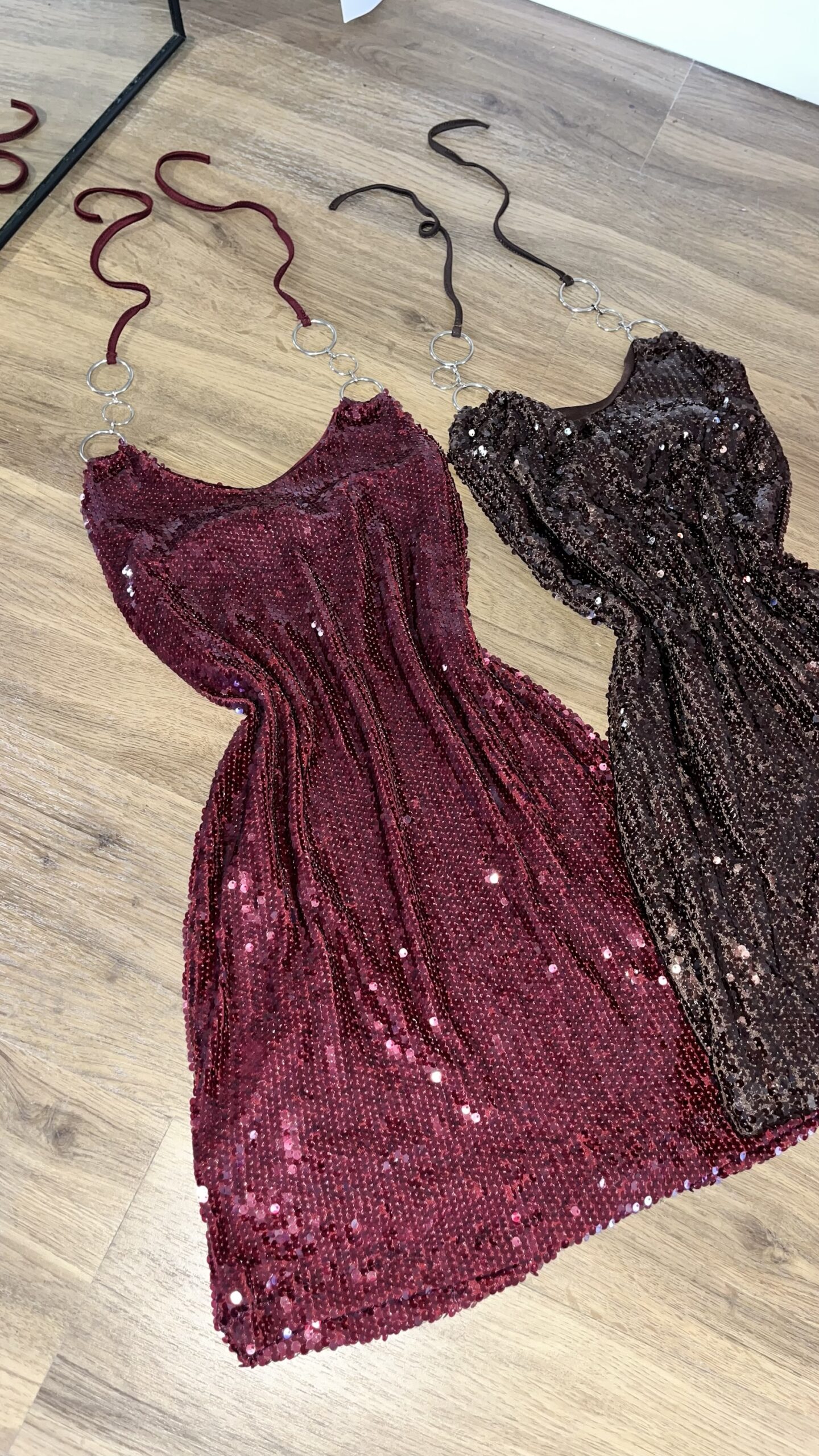 Vestido de lentejuelas con cuello tipo halter atado con apliques en plata